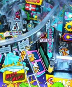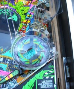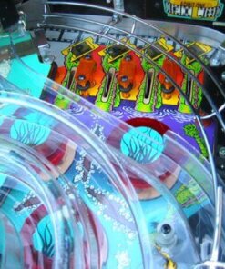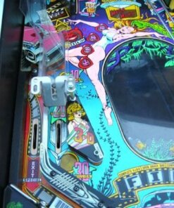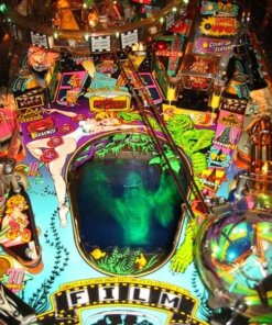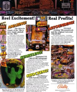 Creature from the Black Lagoon pinball machine was designed by John Trudeau (“Dr. Flash”) and released by Midway (under the Bally brand name). It is loosely based on the movie of the same name. The game’s theme is 1950’s drive-in theater. Its major feature is a holographic creature, set in the middle of the playfield, that lights up and waves its “hand” back and forth during multiball play. The holograph is set behind a green plastic insert, so that the monster appears green. The game was licensed from Universal Studios by Bally so that the backglass artwork, the cabinet artwork, and the creature looked like the original movie actors and monsters.