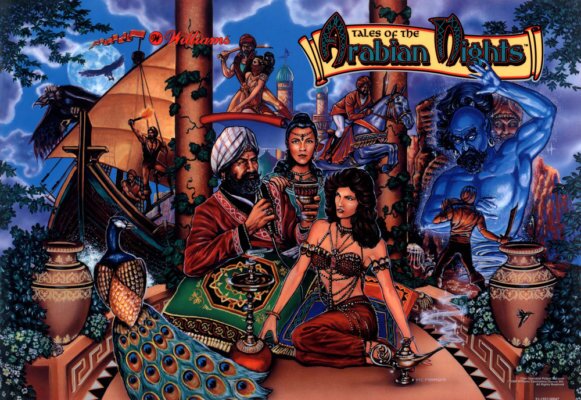 Tales of the Arabian Nights is a Williams pinball machine released in 1996. Designed by John Popadiuk, the game is based on the stories of One Thousand and One Nights and features a blue genie. Players can experience 7 Tales of the Arabian